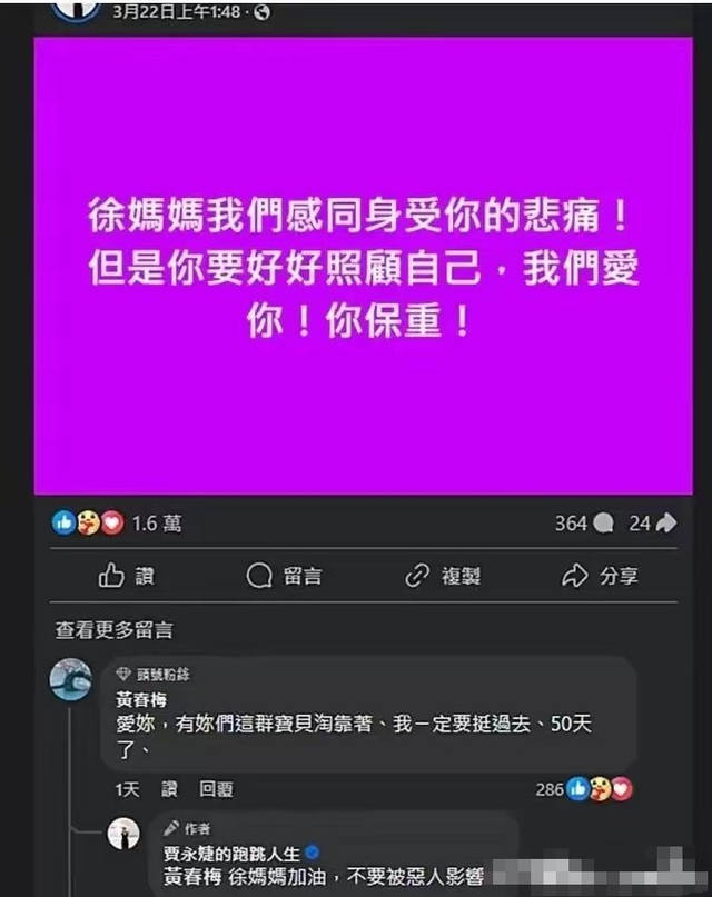 当时大S的好友贾永婕还发文呛声,力挺S妈“不要被恶人影响”,S妈还表示“一定会挺过去,50天了”。
